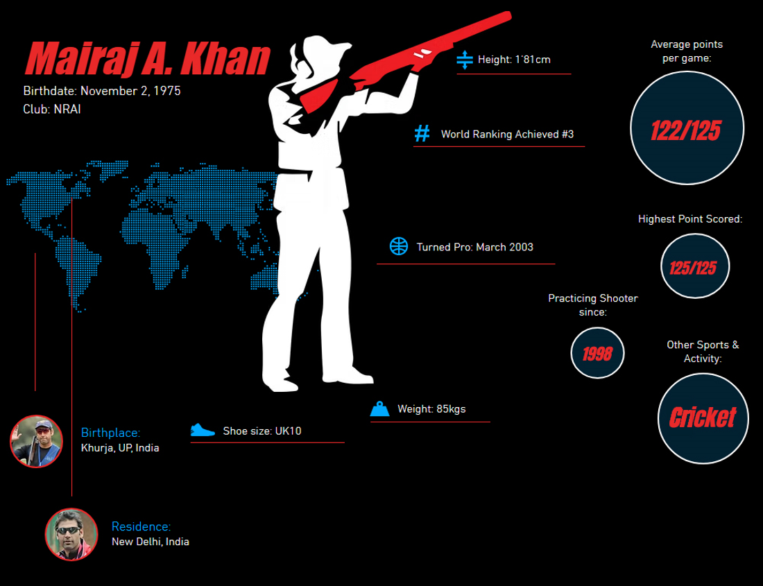 Mairaj was born in a Sunni family of landlords situated in Khurja Bulandshahr a small district Of the Indian state Of Uttar Pradesh. His parents are Mt Ilyas Ahmed Khan and Mrs. Farrukh. He started Sport in 195 right after his college. Shooting was introduced to him through his uncle which gradually his profesion.